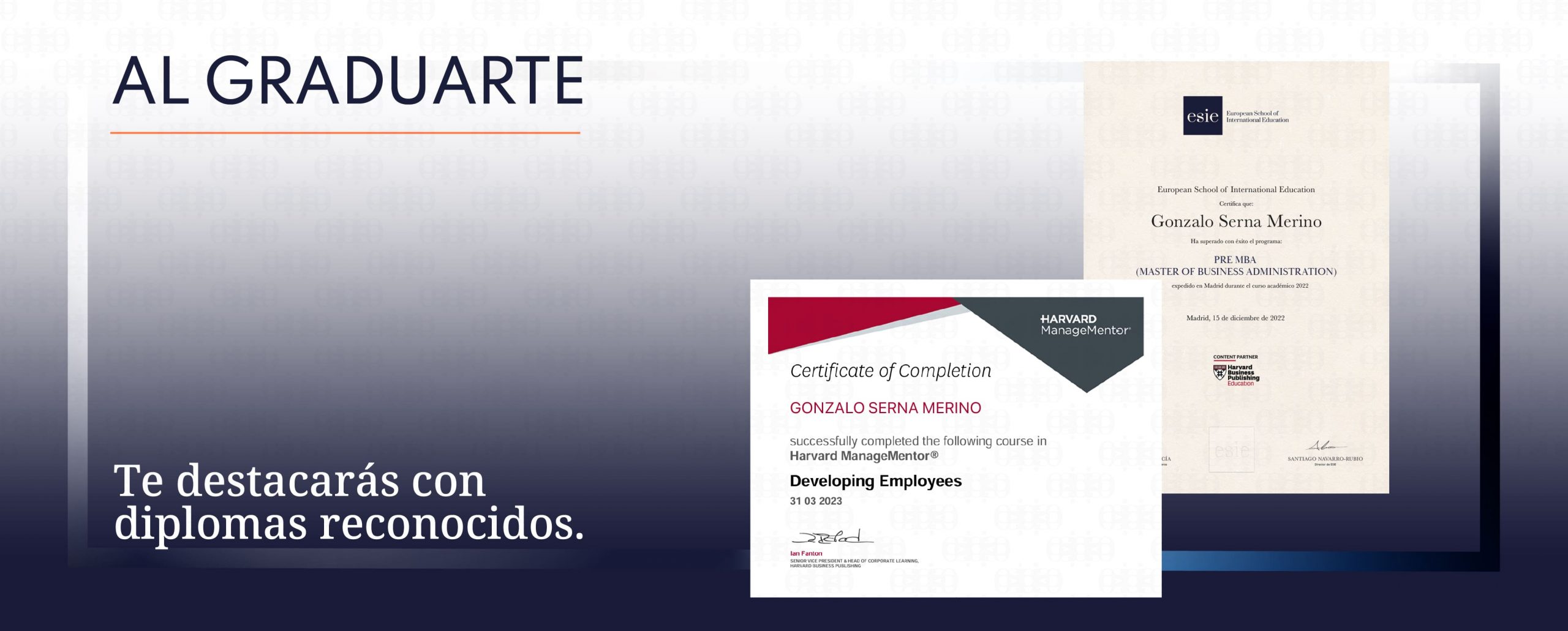 Puedes cursarlo de forma independiente o al matricularte en cualquiera de nuestros programas. Obtendrás una titulación al finalizar el programa que avala los conocimientos adquiridos, además de los correspondientes certificados de finalización de los cursos de Harvard.